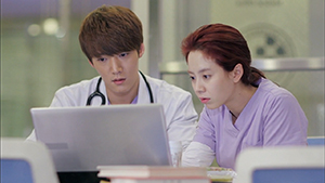 In the interns’ office, Chang Min is researching Granny’s tumour, when Jin Hee asks if he’s going home. He says no, then turns down an invitation to dinner. Jin Hee thanks him for saving Granny, comparing him to Superman. He only responds when she offers to help him research, and they get to work. Junior resident Kim Min Ki (Kwon Min) and the cranky resident (Heo Jae Ho) come by, surprised that they’re still there. They leave again, convinced that Chang Min and Jin Hee are just hiding their illicit behaviour by looking studious. Yay for comic relief!