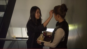 Da Mi is walking past Yoo Ra in the stairwell when the latter places something in the basket that Da Mi is carrying. Da Mi asks Yoo Ra to identify what she just gave her. Yoo Ra walks back, and sticks the object to Da Mi’s forehead, before announcing that it is used chewing gum. Da Mi is clearly used to this rudeness from her wealthy clients, and simply whips the gum off before returning to work.