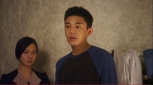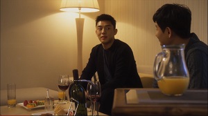 Sun Jae is struggling with socks in the guest bedroom when Hye Won knocks on the door then enters. Sun Jae instantly stands at attention, removing and dropping his sock nervously. Hye Won quietly advises Sun Jae not to drink any wine even if her husband offers. Her fear is that alcohol will loosen Sun Jae’s tongue about their kiss. Sun Jae agrees.