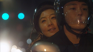 He goes downstairs to ask the snack shop owner to pass his keys to Da Mi, and borrows her moped to drive Hye Won home. There’s an air of teen courtship as he tells her to hold on to him tightly, for safety, and not because he likes it. She smiles and hangs on for the ride, and it looks like a great excuse for skinship as they drive through Seoul, both of them looking happy as the music swells.