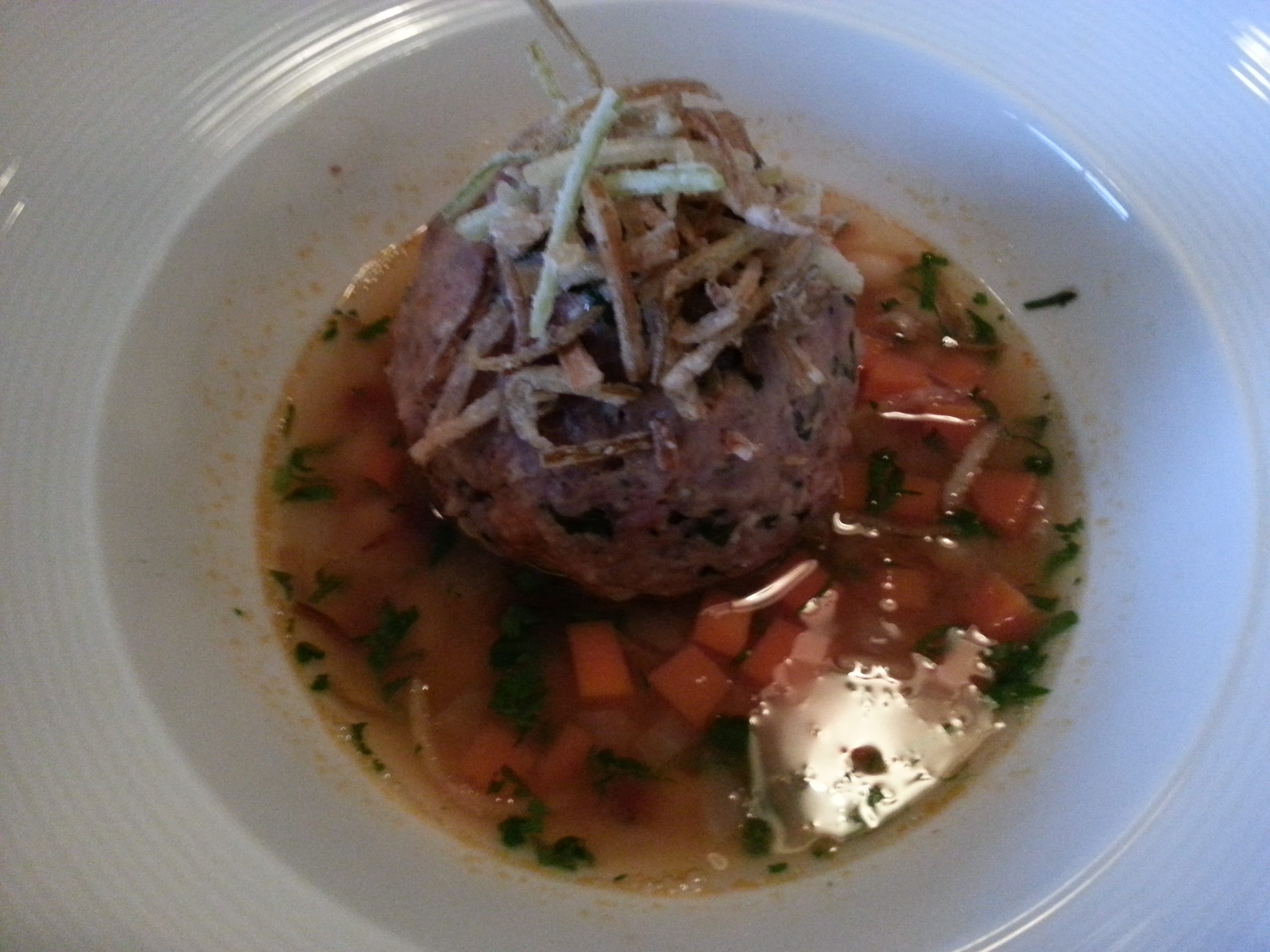 The Giant Meatball Filled with Pulled Pork and Served in a Chipotle-White Bean Broth was the lightest use of pulled pork that I’ve ever had. To make up for the lack of sauce, or fatty components, the temptation would be to over salt. However, that was not the case with this dish. The chef had the courage to let the flavour of the giant meatball simply speak for itself. Personally, I did find myself wishing that a stronger flavour element was added.