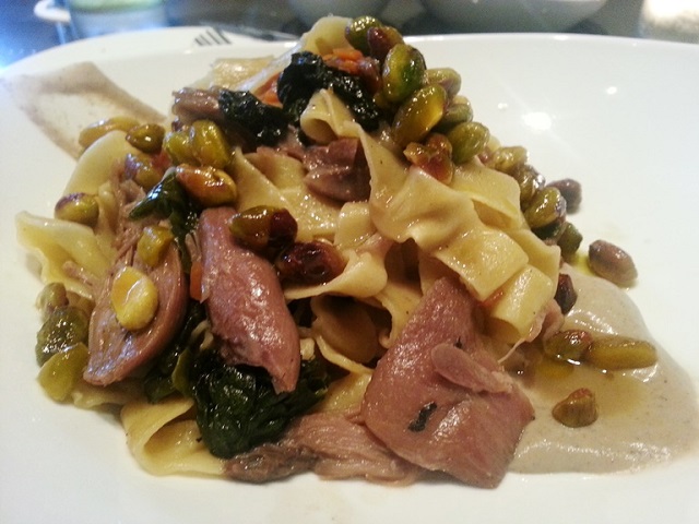 I ordered the Tagliatelle all’Anatra, which was made up of what tasted like wide and flat egg noodles with duck confit and Tuscan kale in porcini stock, and some sunchoke puree and pistachio pesto. The stock soaked in well into the pasta, which remained firm. The duck was very tender, and the pistachios were wonderful little nuggets of nuttiness that were neither too hard nor too soft.