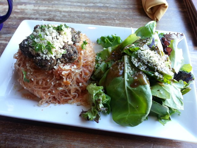 I decided to order a raw dish, which I had never had. Spaghetti n’ Meatballs consisted of kelp noodles in a sundried tomato sauce, fresh basil, Brazil nut “parmesan” and a walnut-zucchini crumble, served with mixed greens and black pepper vinaigrette. The salad was pedestrian, but the kelp noodles were different. Refreshing to be sure, but hardly reminiscent of the comfort food it is supposed to be modelled after. The tomato sauce did little more than stain the noodles, so nuttiness was the dominant flavour. The “meatballs” were skimpy relative to the pasta, and too salty in comparison.