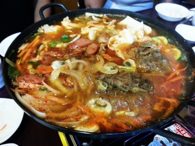 After it became apparent that we were still hungry, we ordered the Modum Jungol: marinated beef, marinated pork, baby octopus, shrimp, sausage, pork bone, assorted vegetables (cabbage, sweet potato, green onion, zucchini, onion, carrot, mushroom), tofu, and crystal noodle, cooked in Joons special Jungol soup. The dish cooked in a shallow pan on a propane gas cooktop right before our eyes. This was my favourite dish of the night as the soup was very flavourful.