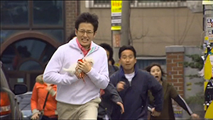 The next day, Soo Kyung gives Phillip a gift, which turns out to be a puppy. She tells him it’s so they can raise it together, but then immediately leaves. Phillip agonizes over his indecisiveness as the puppy refuses to walk. His deep thoughts are cut off by the puppy pooping. Since he has nothing to pick it up with, he drops his handkerchief over it, but is caught by a neighbourhood ahjumma. Rather than ask her for a spare trash bag, he picks up the puppy and runs away. The whole neighbourhood gets together to give chase, but he finally gets away from them, and ends up walking home across a bridge.