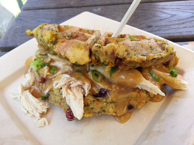Thanksgiving Waffle ★ ★ ★ ★ This is the way to serve tryptophan to the whole family! Stuffing mixed in with waffle batter is put through a waffle maker then loaded with turkey, gravy and cranberries. Each waffle is made fresh to order, the turkey was juicy, and the gravy was not overly salty. It was hard to stop shovelling multiple helpings of this heavy Thanksgiving goodness into our mouths. – Fran’s Restaurant