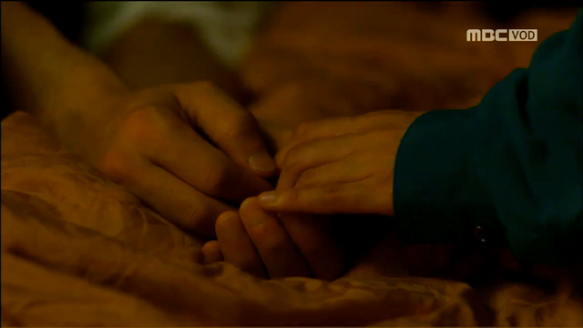 We’ll never know if Gun intended to kiss Mi Young in the first scene of this episode, because her exhaustion finally gets the better of her, and she passes out. He takes care of her through the night, and Mi Young wakes up to find him sleeping by her bedside, holding her hand.