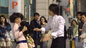 Passers-by point and stare, but Yu Jin is convinced they are just envious of his fabulous style. Dong Wook finally snaps and throws the suit jacket at her, but this is fantasy. In reality, he thanks her for the awful outfit.
