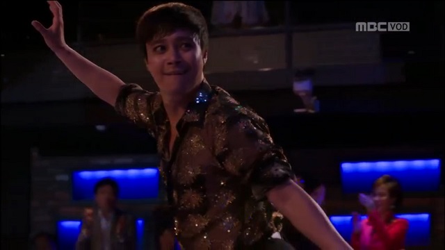 Busy with ballroom dancing, it turns out! We’re treated to the sight of Secretary Tak owning the dance floor in a sparkly, see-through shirt. The dance teacher (one of the reappearing triplets) invites him to take a lesson with their most legendary dancer, Charles, who turns out to be Lawyer Hong in a fantastic frilly pink shirt, bell bottoms, and a rose clutched in his teeth.