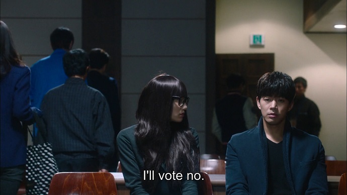 Woo Jin’s team must decide who will vote which way. Only Jung Ah seems indifferent to whether she takes the ‘yes’ or ‘no’ vote. In the end, it is decided that Woo Jin and Jung Ah will vote ‘yes’ and the other two will vote ‘no’. After the votes are tabulated, Woo Jin and Jung Ah are on the winning minority team along with Sung Joon and a female contestant.