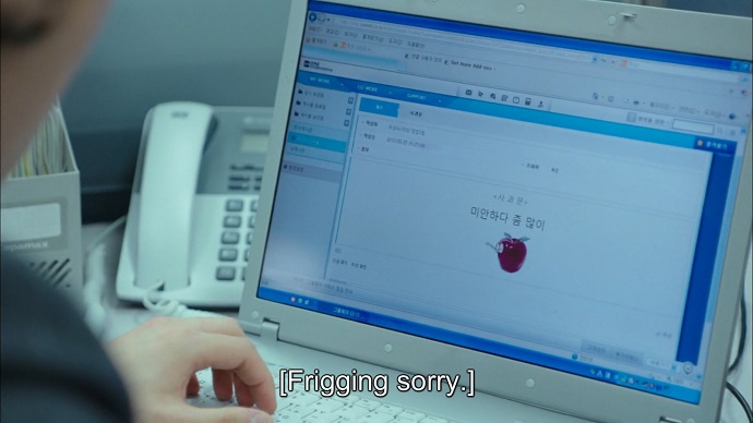 Director Ma had directed Mr. Jung to carefully review Sang Sik’s letter of apology for any mistakes when it was uploaded to the company intranet. It turns out that the scrutiny is not necessary, as Sang Sik’s letter simply consists of the words, “Sorry. Frigging sorry” accompanied by a GIF of a rotten apple.