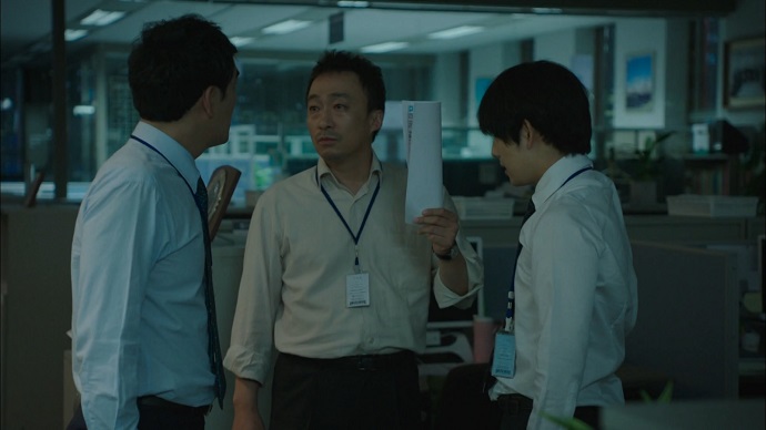 After forcing Mr. Jung to come to his office, Sang Sik loudly claims that he gave the original B/L to Mr. Jung two months ago, and Mr. Jung should have claimed responsibility for the oversight. This prompts Mr. Jung to bring up Sang Sik’s responsibility for someone’s death. Sang Sik angrily throws Mr. Jung against a desk, then walks away in a daze while his boss is reprimanding him for committing an assault.
