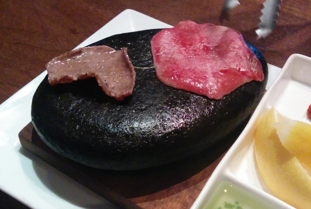 This was followed in short order by the stone-grilled beef tongue. The beef tongue was so thinly sliced that it barely had to touch the stone to be done. The final result was surprisingly tender, and I enjoyed it most wrapped around the sliced scallions, while our dining companion particularly liked the yuzu pepper sauce.