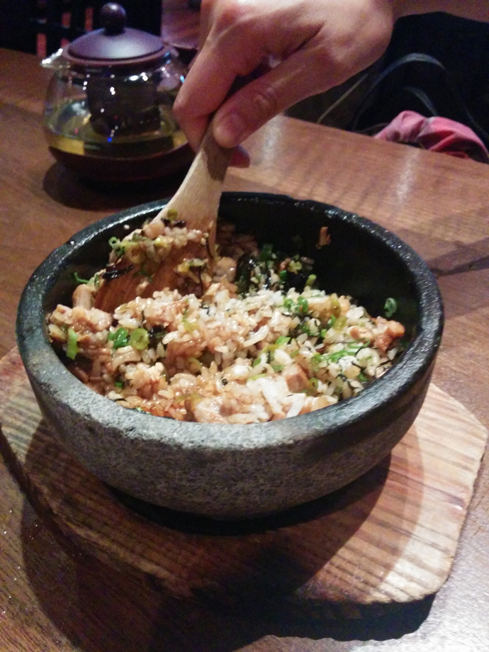 According to the menu, they prepare koshihikari rice with sake and binchokan (charcoal). Intrigued, I searched the menu for a rice dish and landed on our favourite of the night; stone bowl pork kakuni don, or slowly stewed pork belly on rice. The dish itself was a bit reminiscent of stone bowl bibimbap, as the waiter in the kendo uniform mixed it up. I’m not sure if it was the fantastic pork, or the rice or the stone bowl or the vegetables, but this dish had all three of us salivating, and we could easily have consumed another round of it.