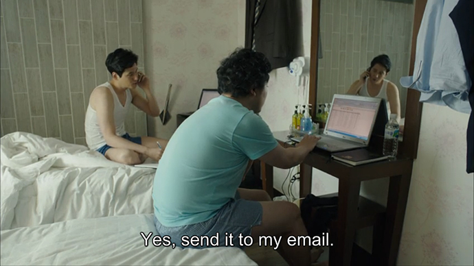 Geu Rae works into the night, creating an outline for the presentation, emails it out, then falls asleep at his desk. He’s awakened the next morning by Dong Sik, who sends him to a sauna to freshen up. Geu Rae is apologetic again, but no one has any reassurance to give him, as Dong Sik gets to work revising the presentation.