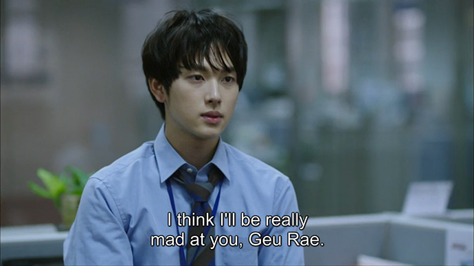 Fibre Team contractor Han Suk Yool (Byun Yo Han) complains to Geu Rae about his supervisor in the staff kitchen. Suk Yool’s pity party is interrupted by the entrance of Mr. Chun, who unceremoniously lays in to Geu Rae for his ignorance in making a suggestion on such a sensitive issue.