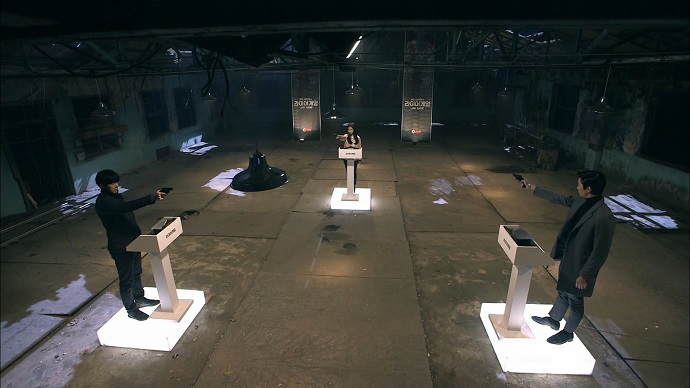 Multiple forces are working against Woo Jin. Just before the final round, Da Jung is taken aside by Station Director Jang (Choi Jin Ho) who insists she should not trust Woo Jin, because he is secretly in league with Do Young to win the grand prize of $10 million. He recommends that she shoot Woo Jin in the final round. Meanwhile, Woo Jin’s cop friend realizes that he is missing a bullet in his gun while watching the “Liar Game” contestants shooting blanks at each other. He jumps to the conclusion that Woo Jin stole a bullet to use on Do Young.