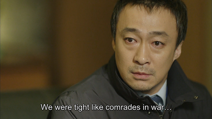 Over tea, the executive director points out that Geu Rae is a lot like Sang Sik, getting on with work without calculation. The executive director reminisces about their work together, wondering why they became so distant. He brings up a case where there was a mini-scandal, and a temp was fired (the one who later died), and wonders if Sang Sik will try to protect his temp again. Sang Sik abruptly gets up to leave the room, and the executive director muses whether Sang Sik said at the time that he would or wouldn’t take responsibility for the temp.