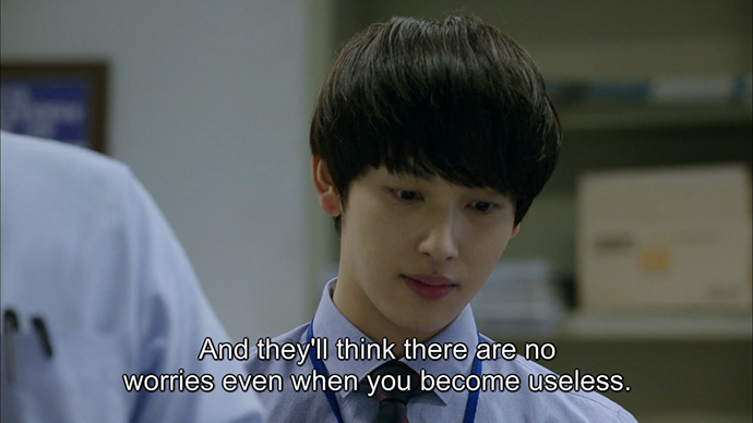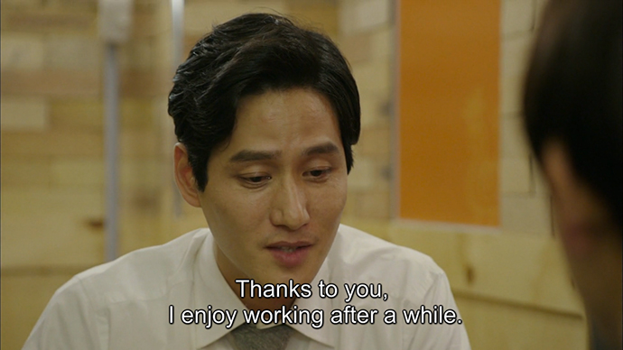 I suspect, however, that Geu Rae is going to turn this into motivation to be the one contractor that makes it to full-time employee status. Which is good, because this sad episode, punctuated by Suk Yool’s humiliation and Dong Sik’s rejection, wasn’t one of my favourites. Here’s Geu Rae’s only smile this episode, to perk you up: