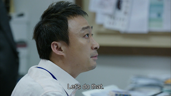 On his way out of the office, Mr. Chun runs into the executive director, who asks how the team is doing. Over tea, Mr. Chun asks whether the executive director can help Geu Rae. Under the executive director’s blank stare, Mr. Chun apologizes immediately thereafter.