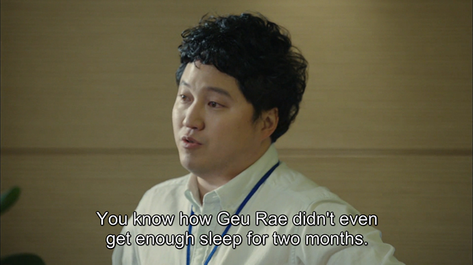 Back at the office, Geu Rae overhears the sales manager berating Dong Sik and Mr. Chun for not resubmitting the proposal without Geu Rae’s name. Geu Rae leaves before they can explain or apologize, and hides out in the stairwell. Sang Sik impatiently hunts Geu Rae down, and sends him back to work since Geu Rae remains in charge of the project.