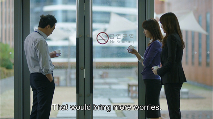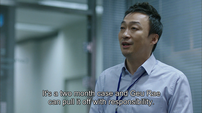 It didn’t really come out in this recap, but one thing I enjoyed was the rapport between the Sales Team members, with Dong Sik and Geu Rae horsing around, Mr. Chun occasionally chiming in, and Sang Sik watching it all like a fond, but worried father. Losing this dynamic was more of a threat than the loss of Geu Rae’s project, as reflected in Geu Rae’s decision.