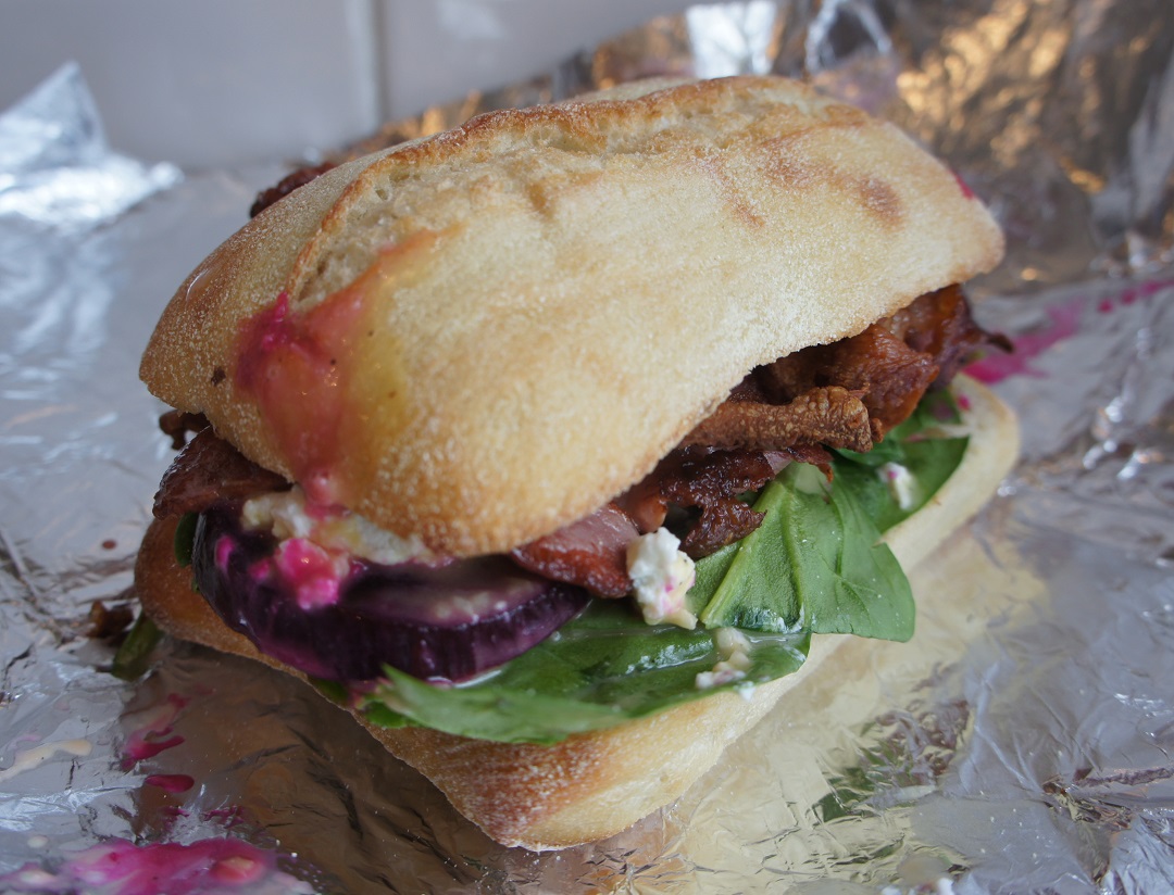 Bacon and beets sandwich: smoked strip bacon with homemade pickled beets, goat cheese, spinach and creamy mustard vinaigrette. The beets were fresh and sweet, which complemented the dense and flavourful bacon perfectly. The texture featured a delicious mix of crunchy and soft with the bread crust and bacon in the former camp and the beets and cheese in the latter. Long after I had finished lunch, I could not help exclaiming, “That was a good sandwich.”