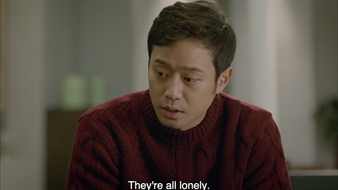 Hong Do shows up looking like a drowned rat at Yi Seok’s apartment, but showers and changes before she sits down to drink. Yi Seok is fascinated by her towel turban, but it’s not long before the two of them are sharing their heartbreak with uncharacteristic honesty, Hong Do from losing Doo Soo, and Yi Seok because of his brother, and his family situation.