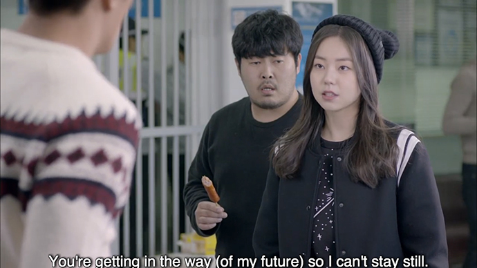 Back in front of the apartment of Hong Do’s policeman crush, Jang Doo Soo (Lee Jae Yoon), Hong Do is trying to psych herself up to talk to Doo Soo, with the pushy encouragement of Yi Seok. Hong Do takes off her helmet, just as Doo Soo comes out, then blurts out that she likes him. Yi Seok, who seemed like a nice guy for a minute there, bursts out laughing at Hong Do as she runs away, appalled.