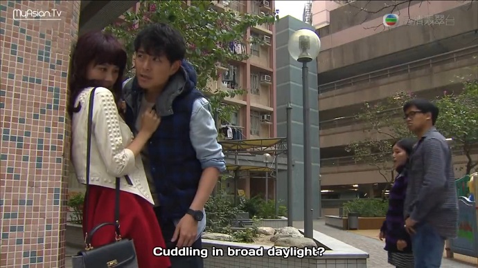 Warring undercover cops, Apple (Priscilla Wong) and Tai Shu (Edwin Siu) pause mid-fight when he spots his father. Turns out that Dad is the new estate security guard. Tai Shu peers out while pressed up against a wall, and Apple becomes aware of how close they are. She comes to her senses, and shoves him away.