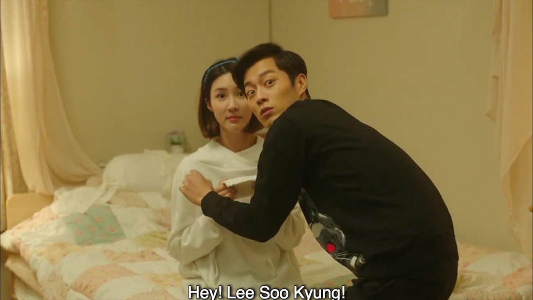 Dae Young, meanwhile, gets his cast removed, then comes over to give the piece with writing on it to Soo Kyung, Just when they’re about to get romantic and share a kiss, Soo Kyung’s friend Kyung Mi bursts in, complaining about her husband, Kyu Sik. Kyung Mi gives Dae Young the third degree, but the minute he leaves, she congratulates Soo Kyung on snagging such a cool guy. Then, remembering her original purpose, Kyung Mi puts Soo Kyung in a headlock to punish her for taking such a cool guy for herself, and leaving her with Kyu Sik.