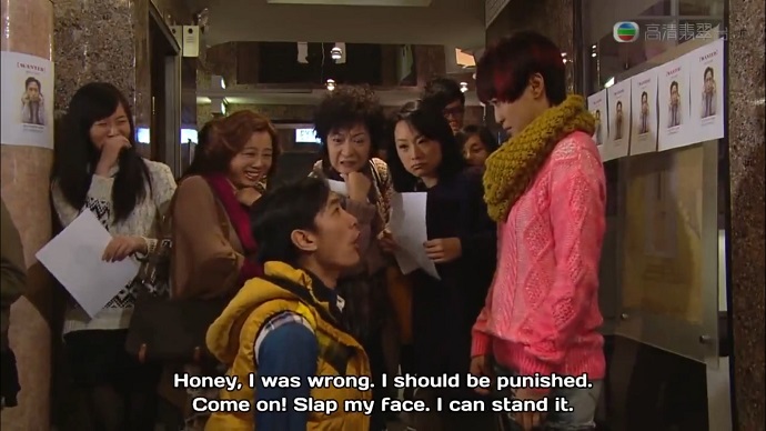 Back home, Fung Nei’s husband is already feeling remorse at driving his wife away, and asks his mother to call Fung Nei back. His mother tells him to go be a man, and beg for his wife back. The next day, he takes this to heart, and publicly declares his mistake, slaps himself, and uses baby talk while pouting to win Fung Nei back.