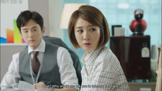 Meanwhile, Soo Ji is in a work meeting with Sang Woo when she decides to put Dae Young’s seduction lessons into action. Her pointed smiling causes Sang Woo to ask if she wants to say something. Her request for help with removing staples makes things awkward. When she runs to the washroom for cover, Sang Woo and co-worker, In Na speculate that Soo Ji may be suffering from Bell’s palsy.