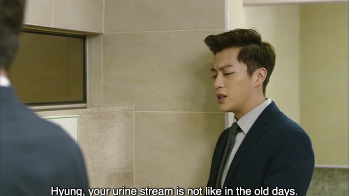 Dae Young is peeing when he’s joined in the washroom by Taek Soo. Dae Young points out that Taek Soo can’t pee like he used to, due to lack of exercise. In the end, he convinces Taek Soo to buy Soo Ji’s bike, but he has to give up his apartment entry code in order to seal the deal.