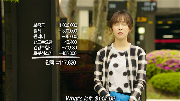 Outside of Sang Woo’s place, Soo Ji stands with a robot vacuum, and calculates how her extra $1000 disappeared so quickly. When Sang Woo comes out, he tells her to return the vacuum since he found his old one, but the passing security guard adds that it was broken. Soo Ji asks him to accept the vacuum regardless, but forgets all about it when he invites her to Seoul for the weekend, so they can date in comfort. Upstairs, it turns out that Sang Woo already has a replacement vacuum.