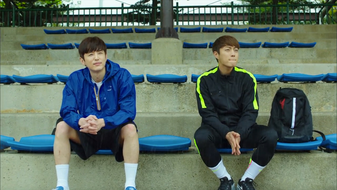 Meanwhile, her neighbour, fast-talking insurance salesman Dae Young, gets a text from Sang Woo inviting him to play soccer the next day. Given that soccer is rained out, Sang Woo and Dae Young discuss Dae Young’s developing feelings for Soo Ji instead. Dae Young is not sure if he likes her yet, but is willing to put his feelings aside. Sang Woo warns him to get over her, then points out that he doesn’t want to lose a friend, either. They bond as Sang Woo puts Dae Young in a head lock, but Dae Young interrupts to point out that Sang Woo should occasionally take Soo Ji to eat on their dates.