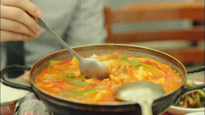 At the police station, Dae Young shouts at an indifferent policeman while a shell shocked Soo Ji watches. Afterwards, a frustrated Dae Young rebukes Soo Ji until she simply says that she is hungry. Dae Young takes her for some classic comfort food, kimchi jjigae, then cheers her up by imitating her. Soo Ji eats the pain away followed by drinking the pain away with soju.