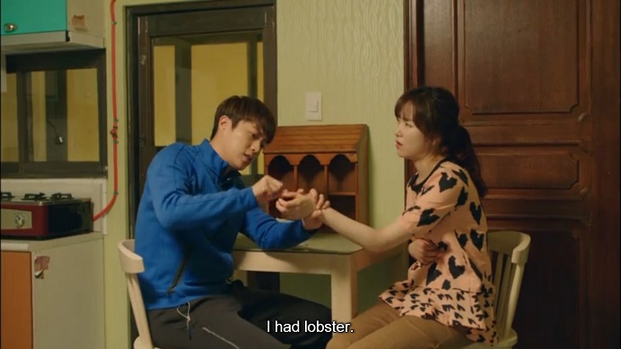 It turns out that Sang Woo is taking Soo Ji out for lobster dinner. Soo Ji is so preoccupied with the possible price tag of the dish that she has no appetite. She eventually eats with Sang Woo’s prompting, but later suffers indigestion, which she has never experienced before.