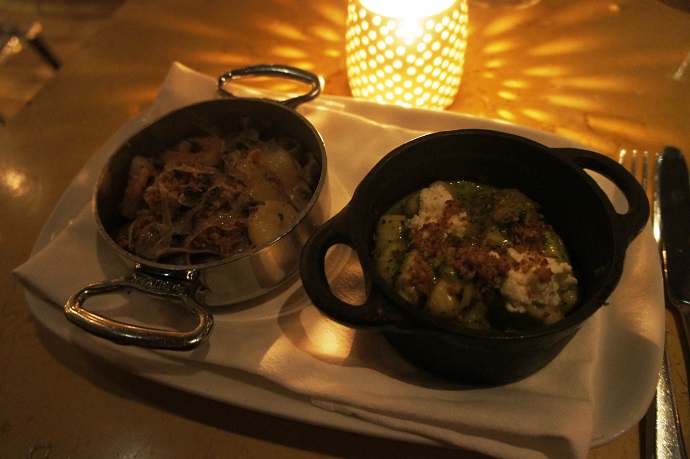 Mystery extra pasta dish and Anson Mills Blue Corn Stradette