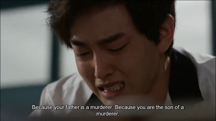 In the interrogation room, Hyun gives an angry Jin Woo an article about his father’s murder, and asks him to identify which of the men, the murderer or the victim, was his father. When Jin Woo starts to break down, Hyun presses the point, that Hyun Cheol probably used him, since he looked just like his father. Jin Woo used Hyeon Cheol too, to explain his own violent tendencies and anger. Jin Woo breaks down completely as the detectives run into the room, and Hyun walks away.