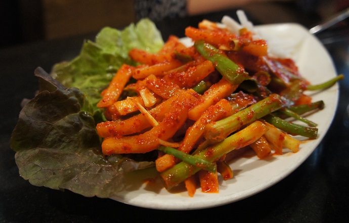 Overwhelmed by the extensive menu, we chose the Bossam – steamed pork belly with cabbage wrap and spicy, pickled radish, and Asian pear – because it was listed as a dish for two. Individually, the ingredients tasted passable, but brought together, the resulting wrap was surprisingly delicious.