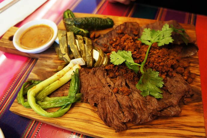 Next up was the Platillo Tres Carnes, with two kinds of thinly sliced beef and house made chorizo. On the side was grilled cactus with queso fresco, beans and some grilled vegetables. This one came with tortillas, which helped with the flavourful, but dry meats. Rolling them up in a tortilla with sauce and my vegetable of choice mellowed them out to the point of deliciousness. If I’m ever in LA again, the only thing that would prevent me from returning is the location. Otherwise, I’d probably go back and try the different moles, and save the drinks for later.