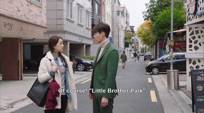 Walking away from the restaurant, Ri Hwan brings up his conversation with Uncle Gangster to Haeng Ah, and they decide to speak with Sun Young together. They have a cute moment when Ri Hwan takes offence at Haeng Ah’s ignorance regarding what he does for a living, then forces her to change his name on her phone to something more flattering than “Little Brother Park”.