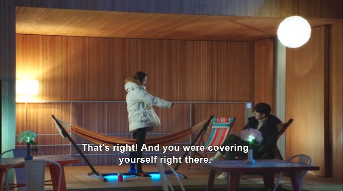 On Ri Hwan’s cold patio, he and Haeng Ah sit in silence, as he sulks over being slapped. Haeng Ah tries to convince him that remaining chaste is normal for a dating couple, before admitting that she likes him, but is still worried that a physical relationship between them will be awkward. They recall when they first met, and she saw him naked in a bathtub. She refers to Ri Hwan as “little”, and he is once again, outraged.