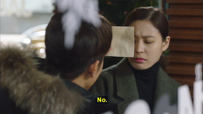 Meanwhile, Se Young drops off Joon Soo at his mother’s restaurant. Joon Soo finally proposes a solution to their problem, that they ignore other people’s words and just love each other. Se Young likes Joon Soo enough to give it a try, but not enough to hug him in public. When Joon Soo’s mother comes out of her restaurant, Se Young and Joon Soo spring apart like guilty teenagers.