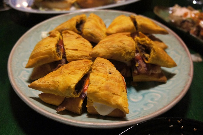 Jamaican Patty Double Down – Two cocktail patties, bacon, Swiss cheese fondue, sriracha