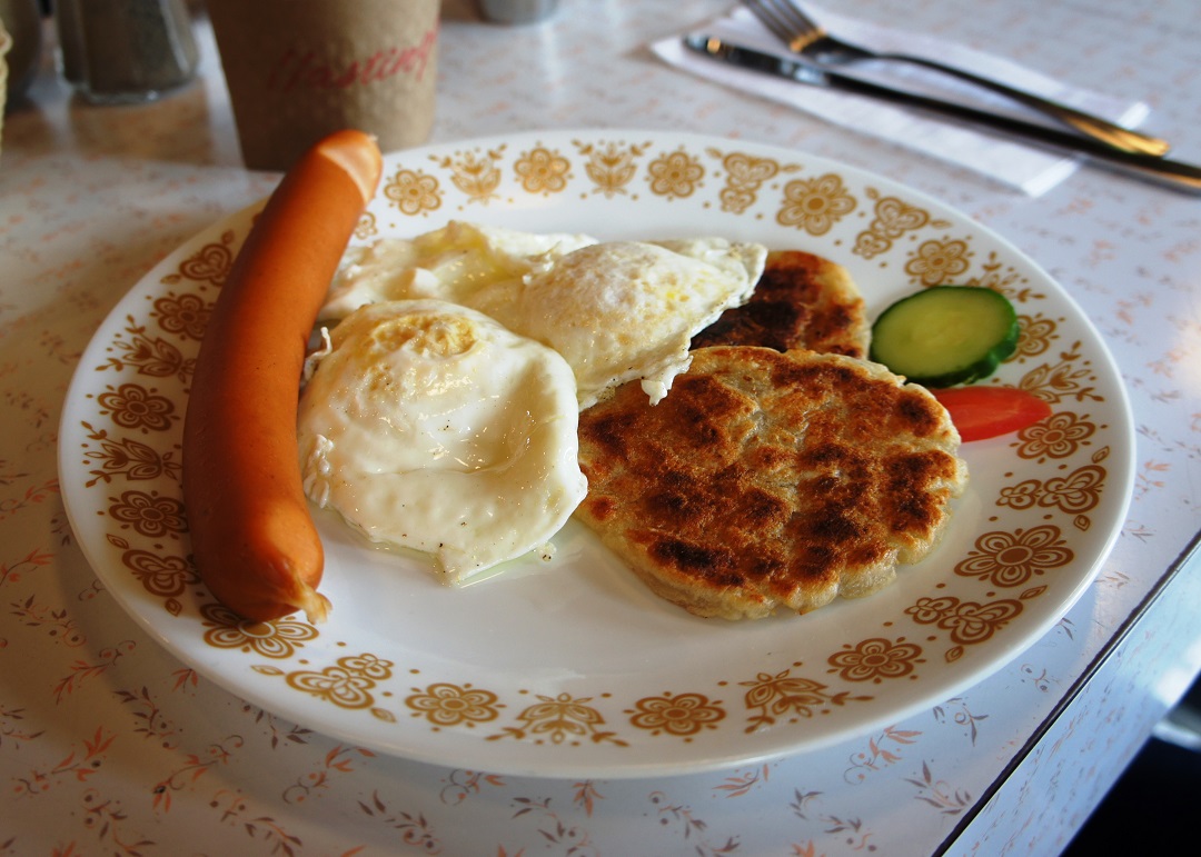 Featured above is the Polish Breakfast: two eggs, parówka, two potato pancakes, and Polish bread. The parówka (aka Polish weenie) is like the standard issue hot dog, but softer and slightly smoky. The potato pancakes were crispy on the outside, and dense and starchy on the inside.