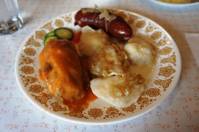 I ordered the Hungry Tata’s Lunch Plate: one cabbage roll, one kielbasa, four traditional pierogis, Polish bread, sauerkraut and pickle. The cabbage roll was bigger than I expected, and while it was delicious, the pierogis and kielbasa were my favourites.
