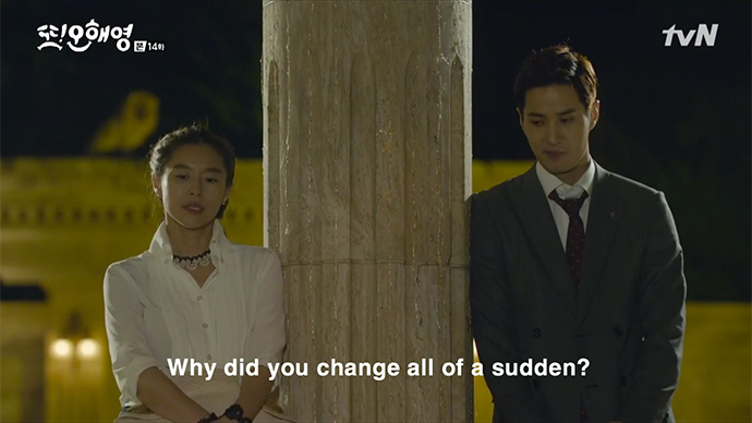 Having finally mutually confirmed their love, Do Kyung (Eric Mun) and Hae Young (Seo Hyun Jin) are so happy that they frolic through the streets, hugging each other and kissing. They find a spot to themselves, and Hae Young thanks Do Kyung for pouring out his emotions to her and charging at her wholeheartedly.