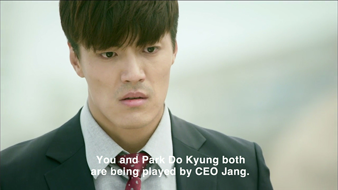 As Tae Jin drives his old business partner, Chan Soo to the airport, he notices that Chan Soo’s shoes are the ones he saw at Chairman Jang’s house a few days ago. He also notices that while Chan Soo says he’s going to China, he’s checking the weather somewhere else. These realizations come too late, since on his next visit to the office, Tae Jin discovers that Chan Soo has taken off with all the money, and that they’re being raided. A man tells him that Chan Soo had been stealing from him before, and that Chairman Jang had pulled out his investment because of it.